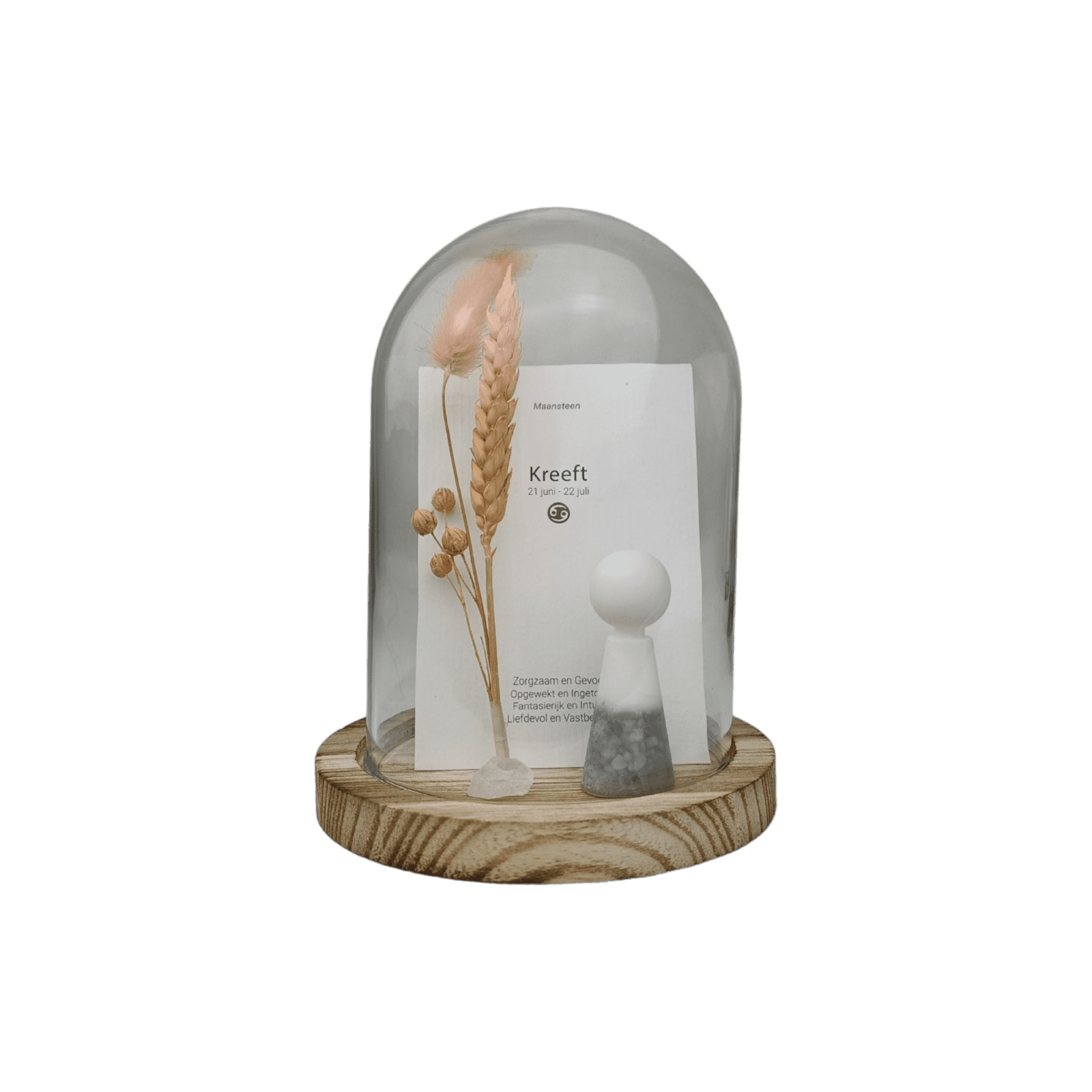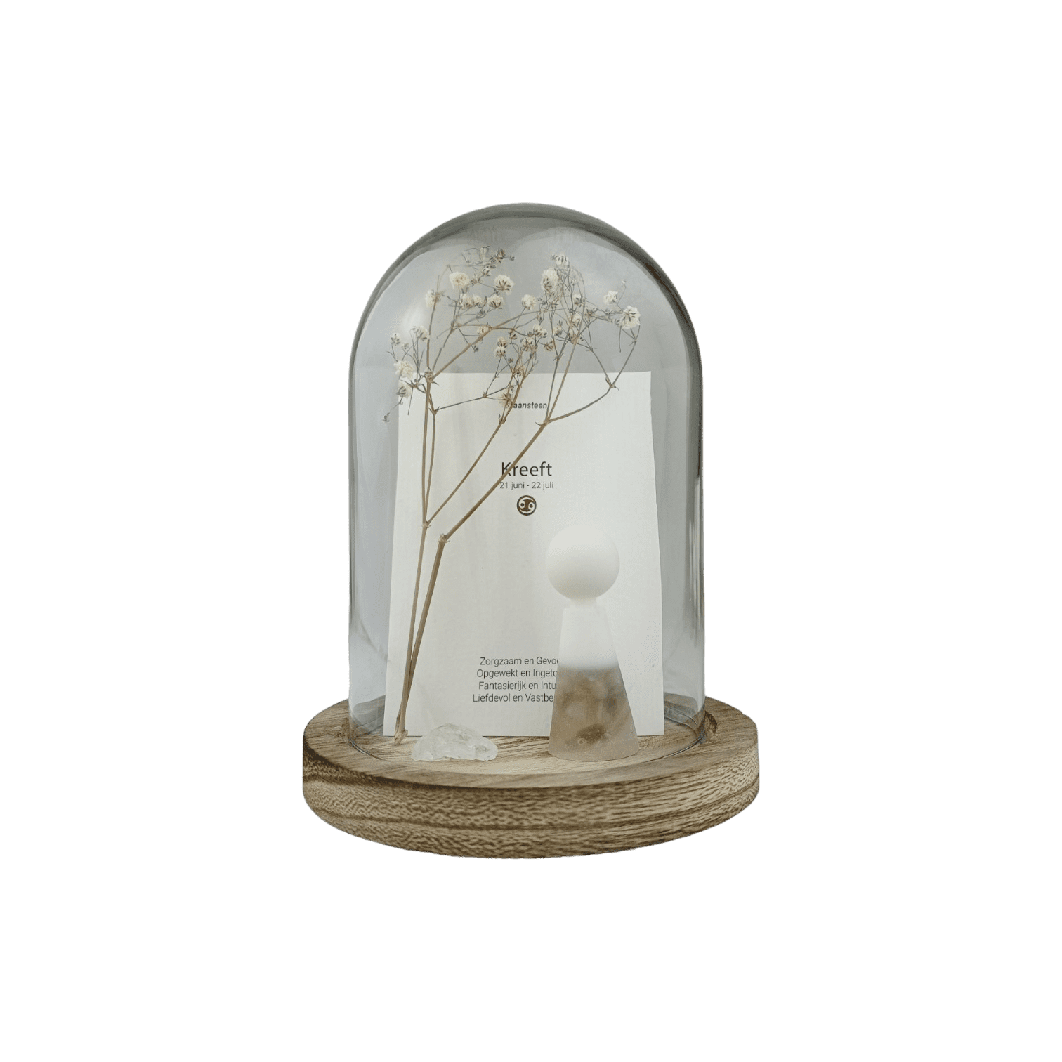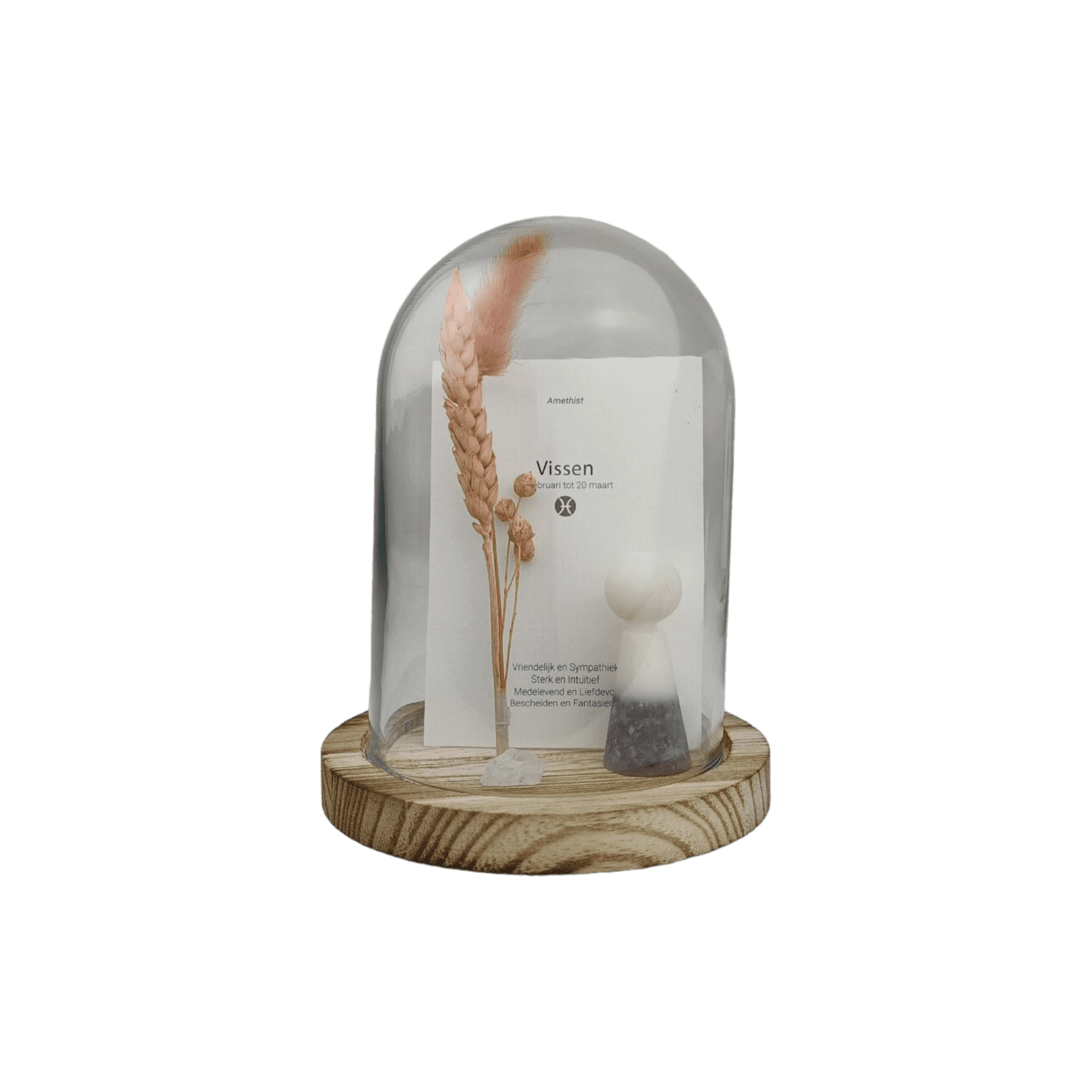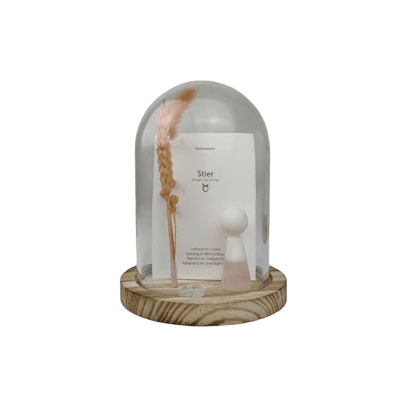 Bij iedere sterrenbeeld behoort een passende geboorte- edelsteen met eigen kenmerken én werking. Dit geweldige setje is inclusief glazen stolp, droogbloem, los bergkristal edelsteentje en de horoscoopkaart.