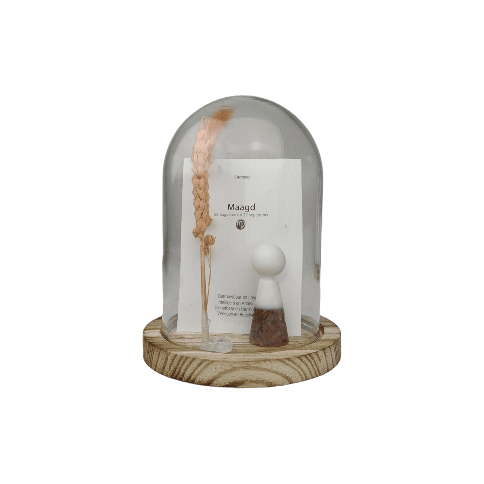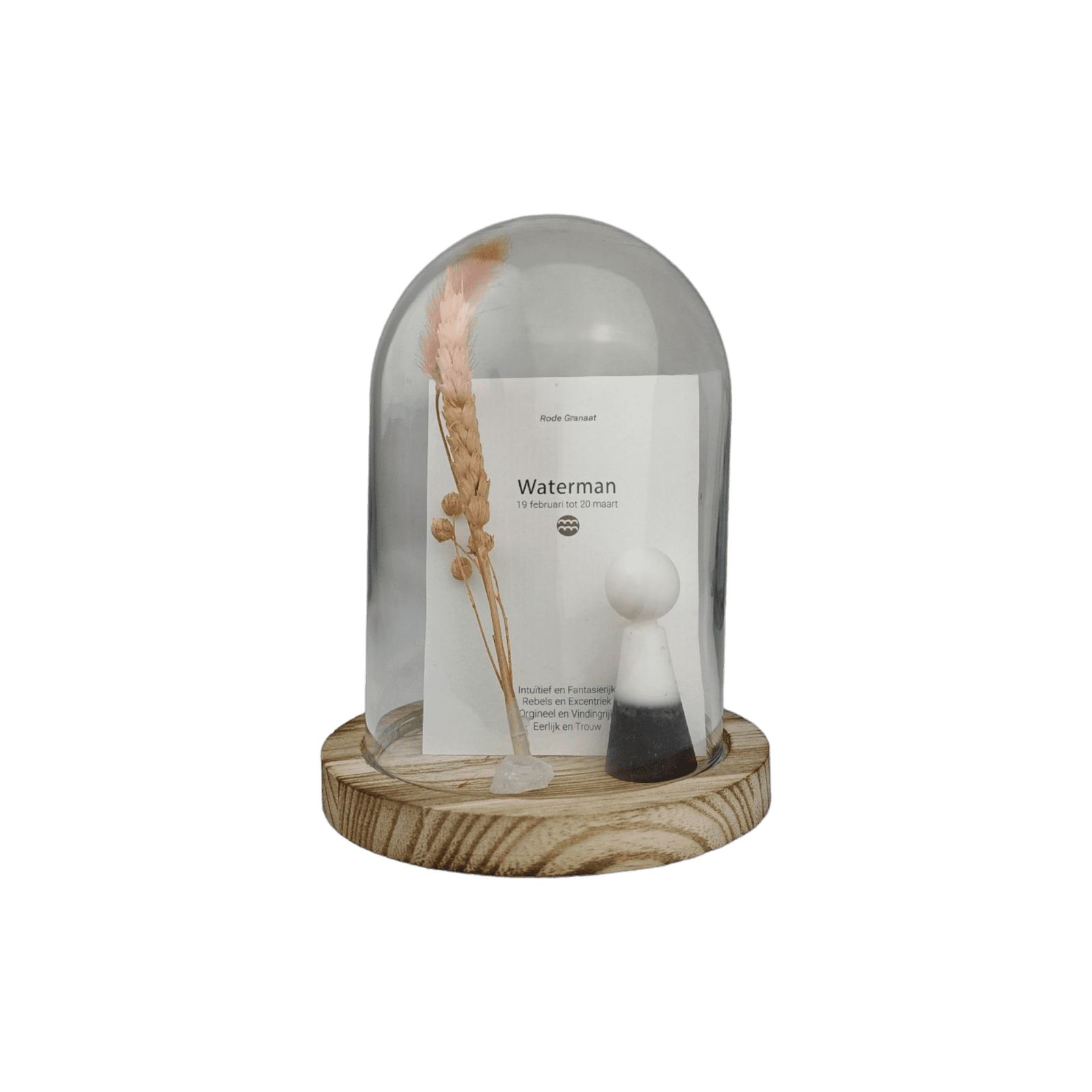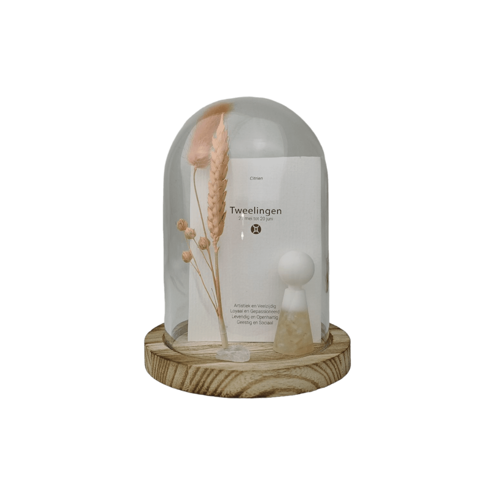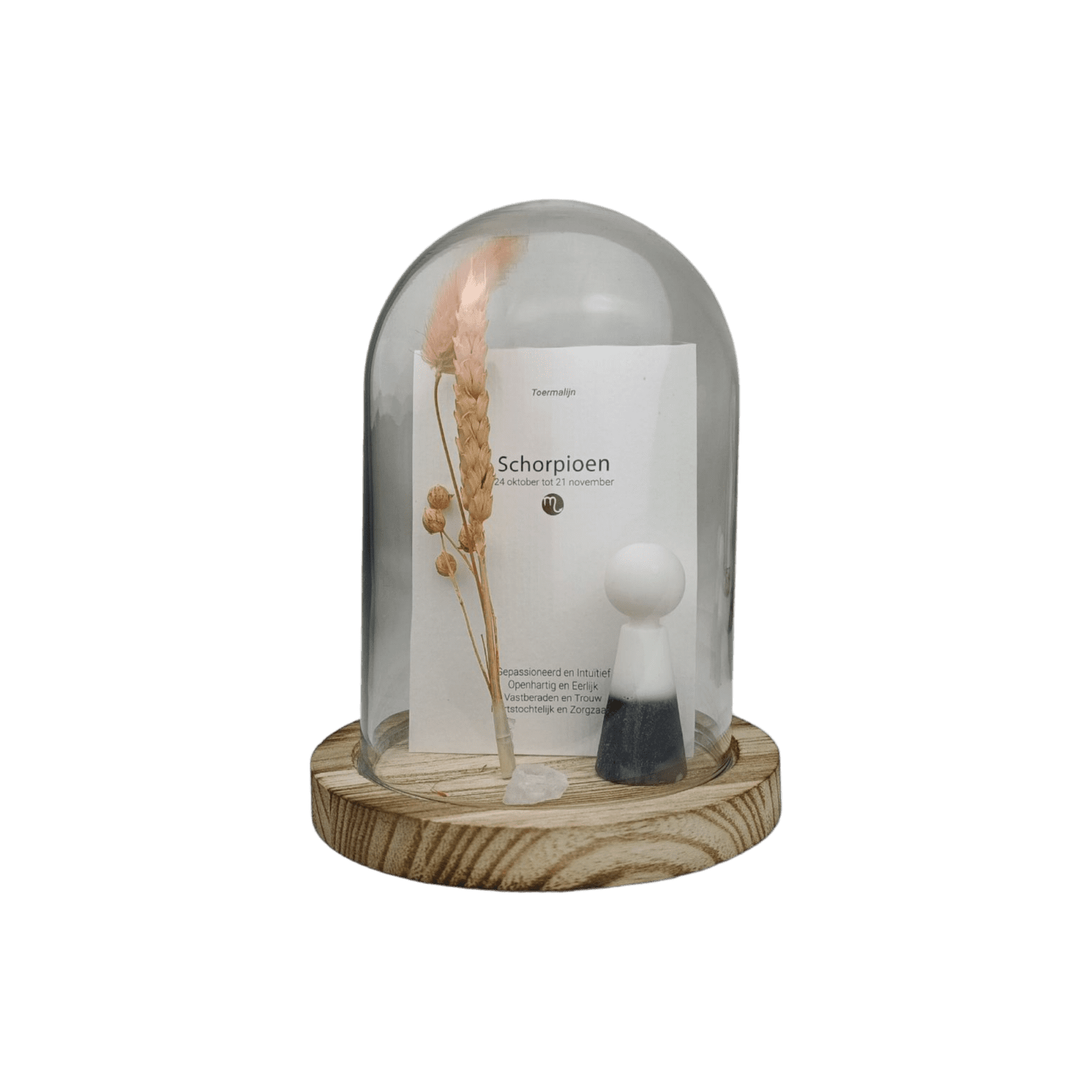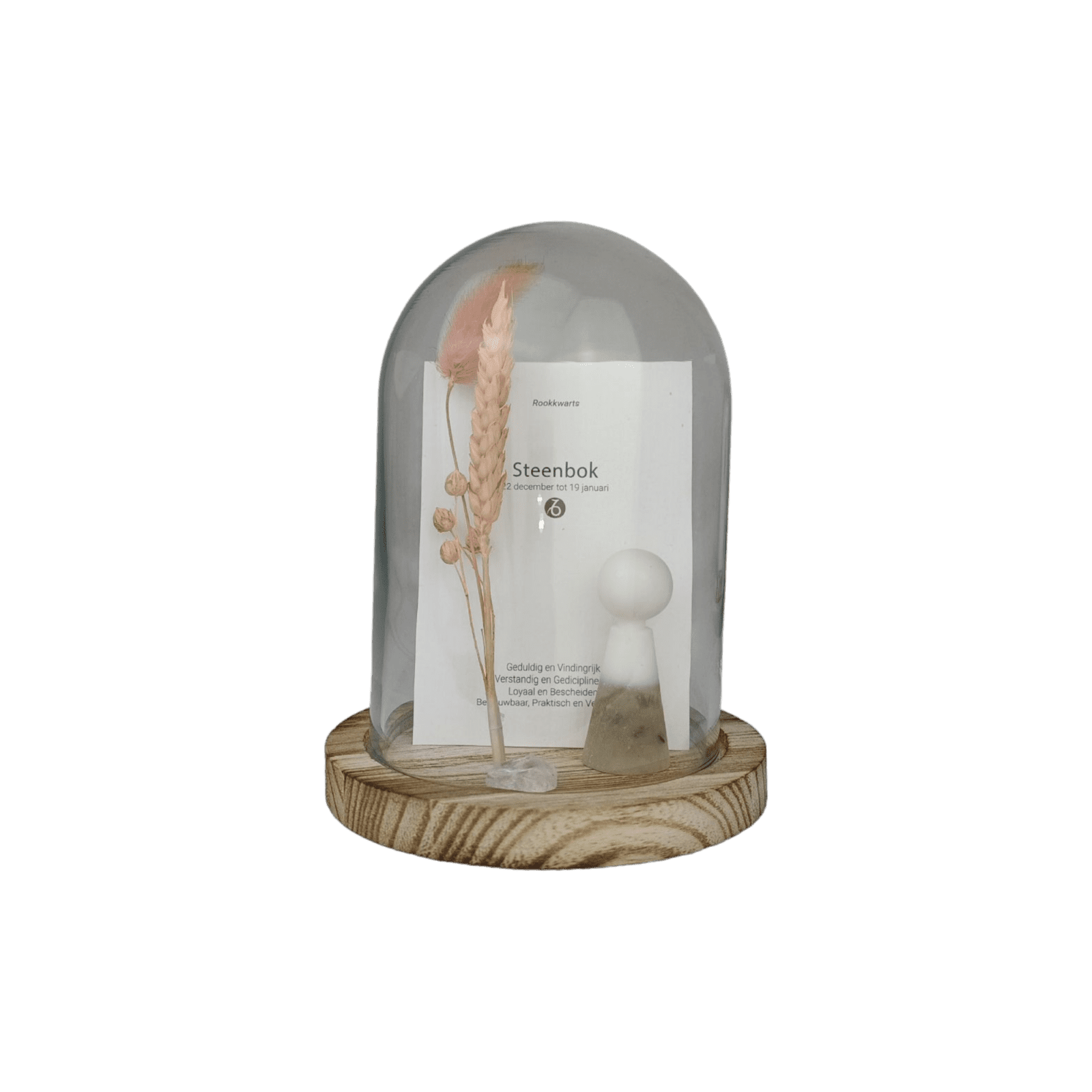 Bij iedere sterrenbeeld behoort een passende geboorte- edelsteen met eigen kenmerken én werking. Dit geweldige setje is inclusief glazen stolp, droogbloem, los bergkristal edelsteentje en de horoscoopkaart.