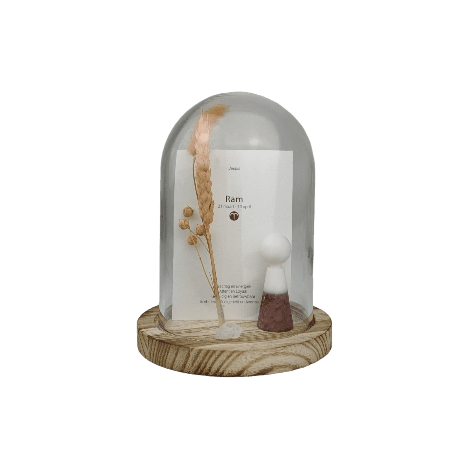 LET OP! De combinatie droogbloemen en edelsteen kan afwijken van de afbeelding ivm wisselende voorraad van de leverancier. Het product is met de hand vervaardigd, waardoor een klein luchtbelletje soms niet is te voorkomen.
