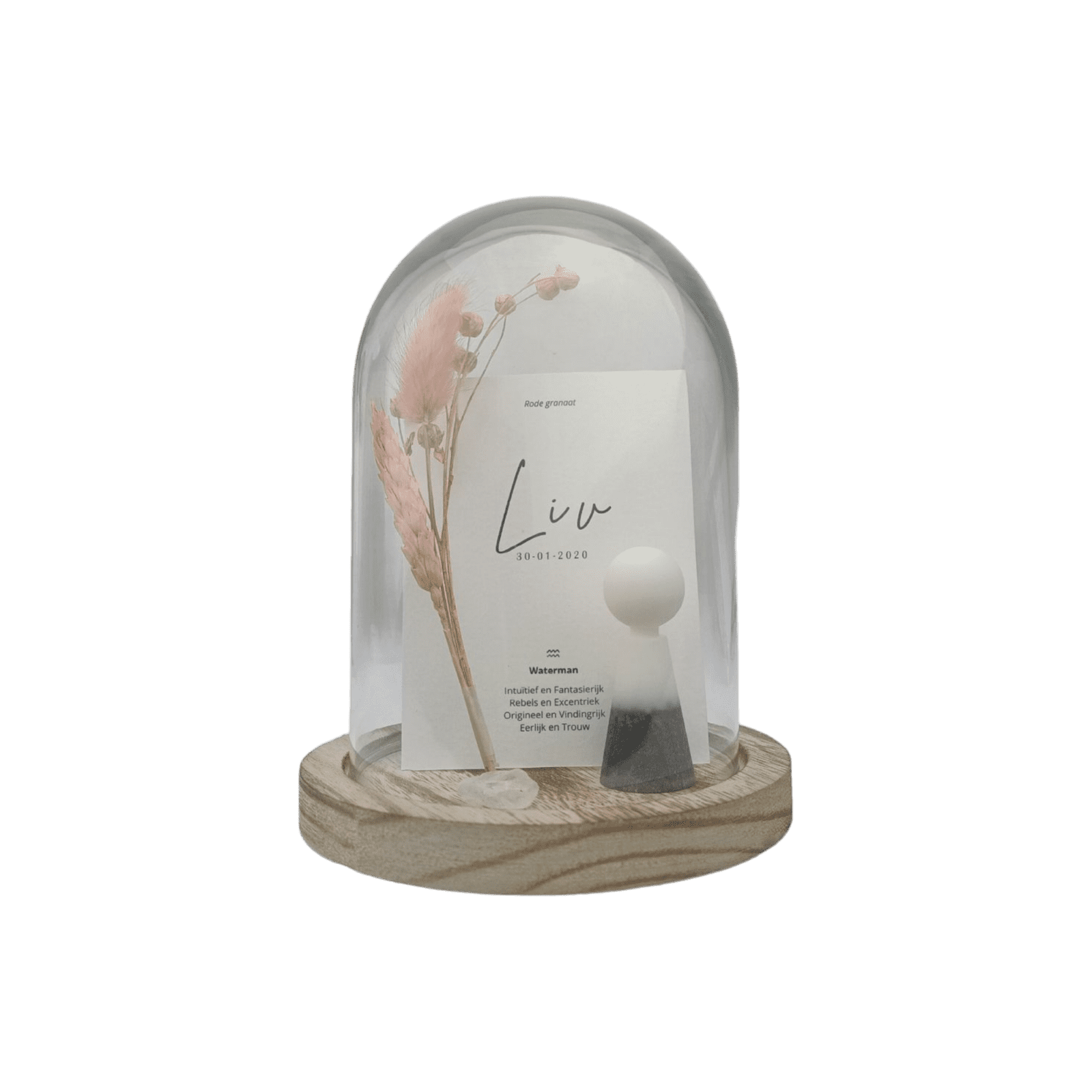 LET OP! De combinatie droogbloemen en edelsteen kan afwijken van de afbeelding ivm wisselende voorraad van de leverancier. Het product is met de hand vervaardigd, waardoor een klein luchtbelletje soms niet is te voorkomen ook in de handgeblazen glazen stolp.Heeft u specifieke wensen? Neem dan even contact op.