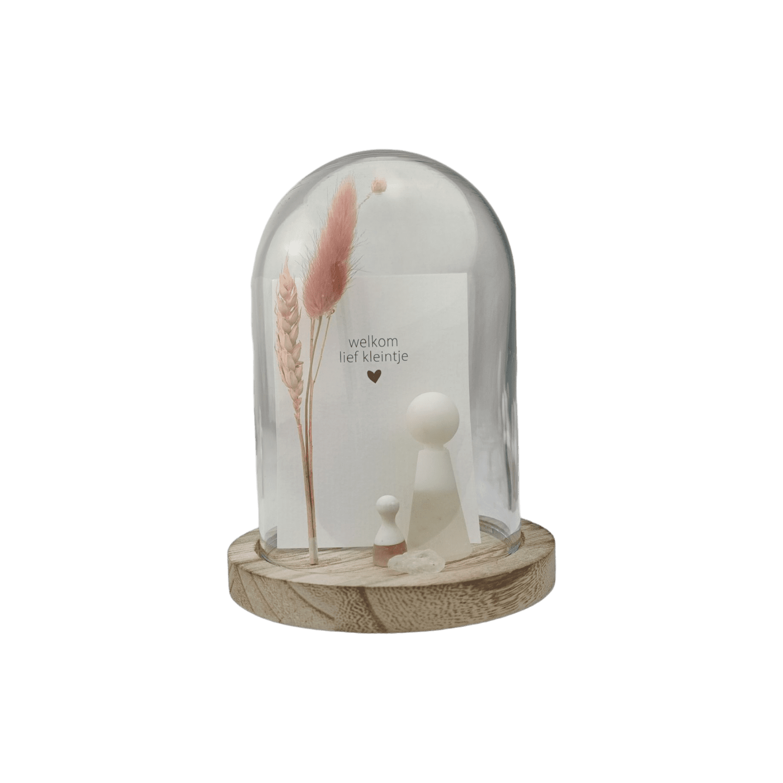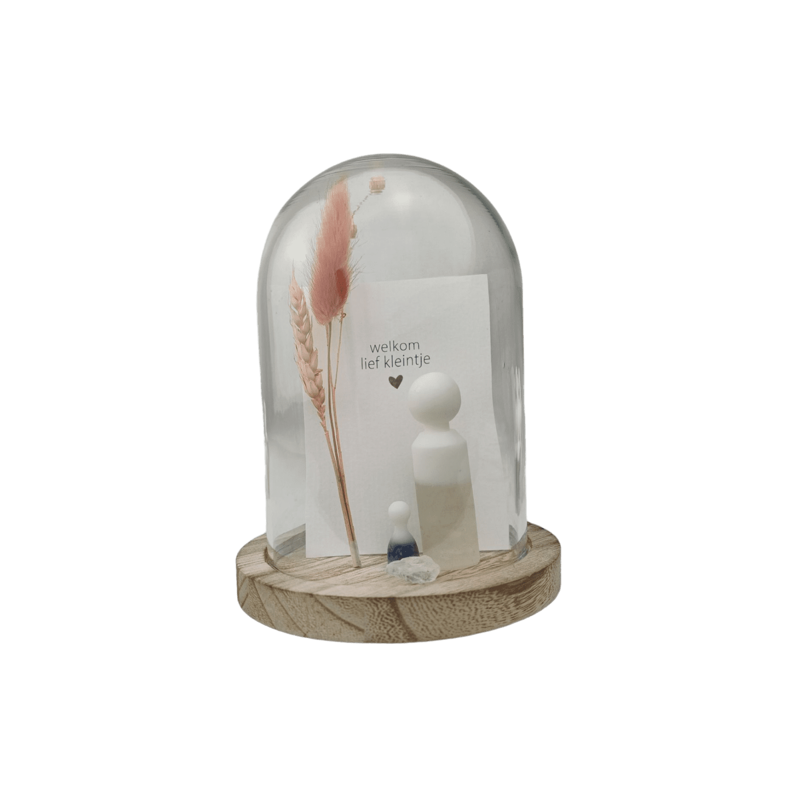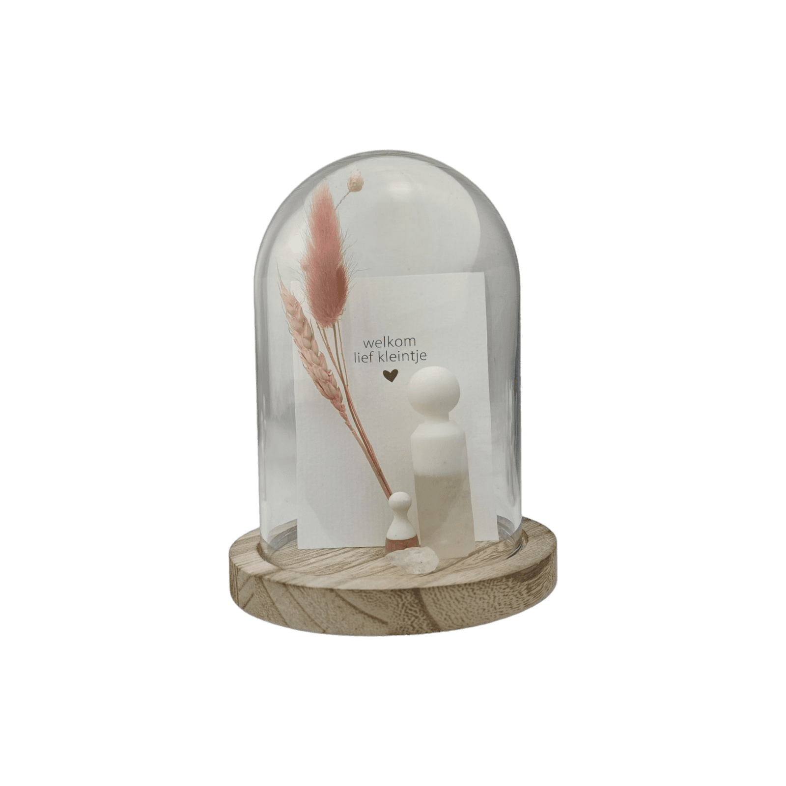 Inclusief glazen stolp, droogbloem, edelsteen en een kaartje.