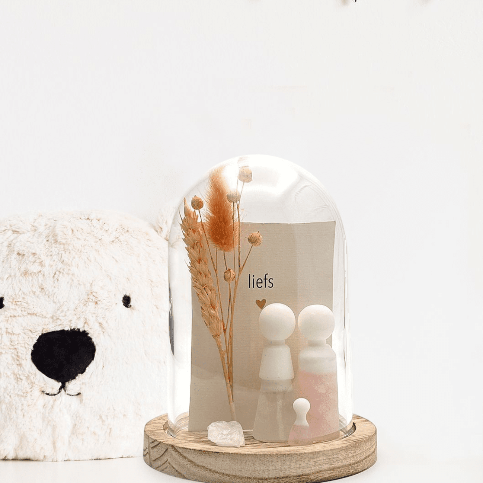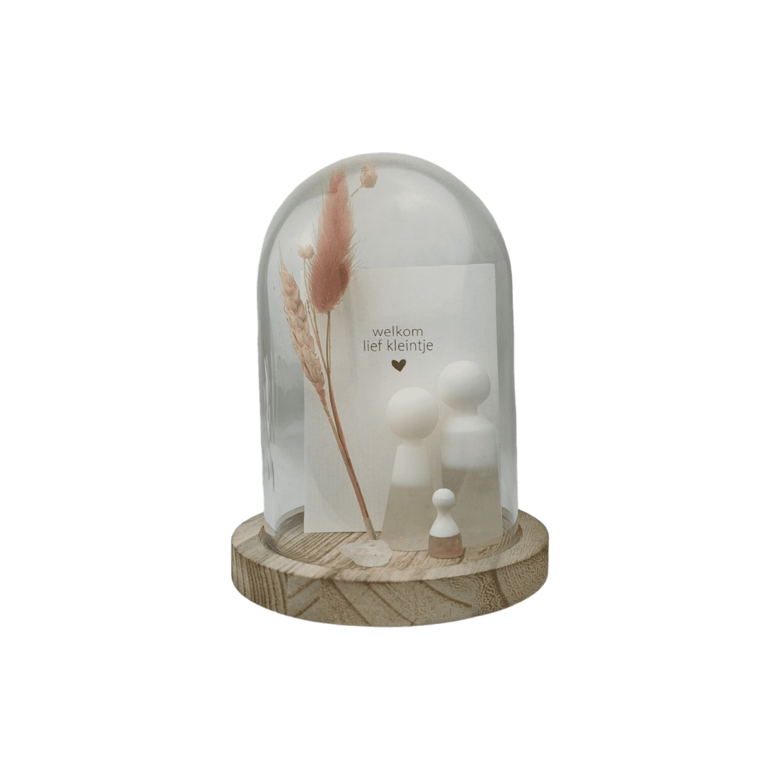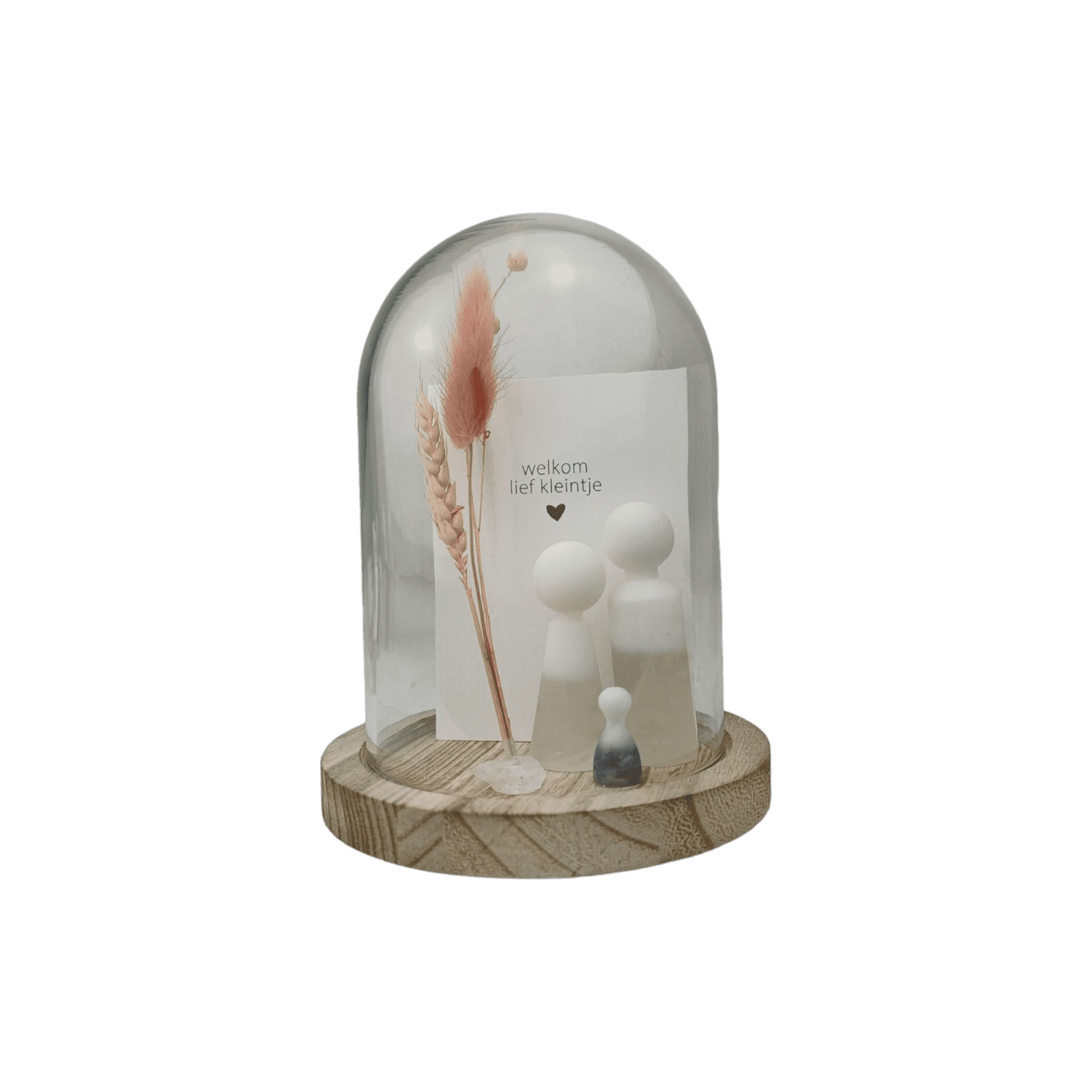 Inclusief glazen stolp, droogbloem, edelsteen en een kaartje.