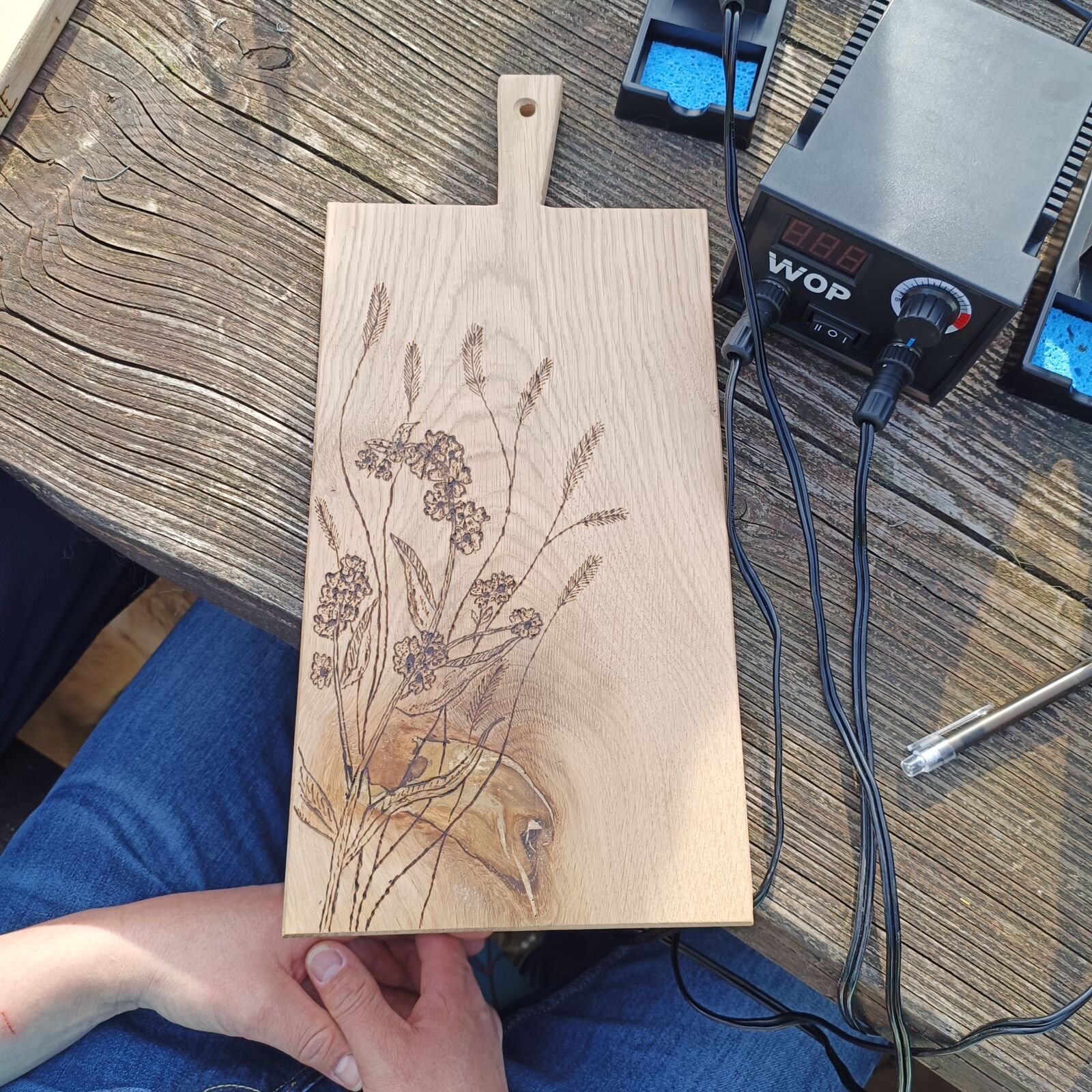 Tijdens deze workshop van 2 uur ga je een prachtige eikenhouten tapasplank versieren met jouw eigen ontwerp.