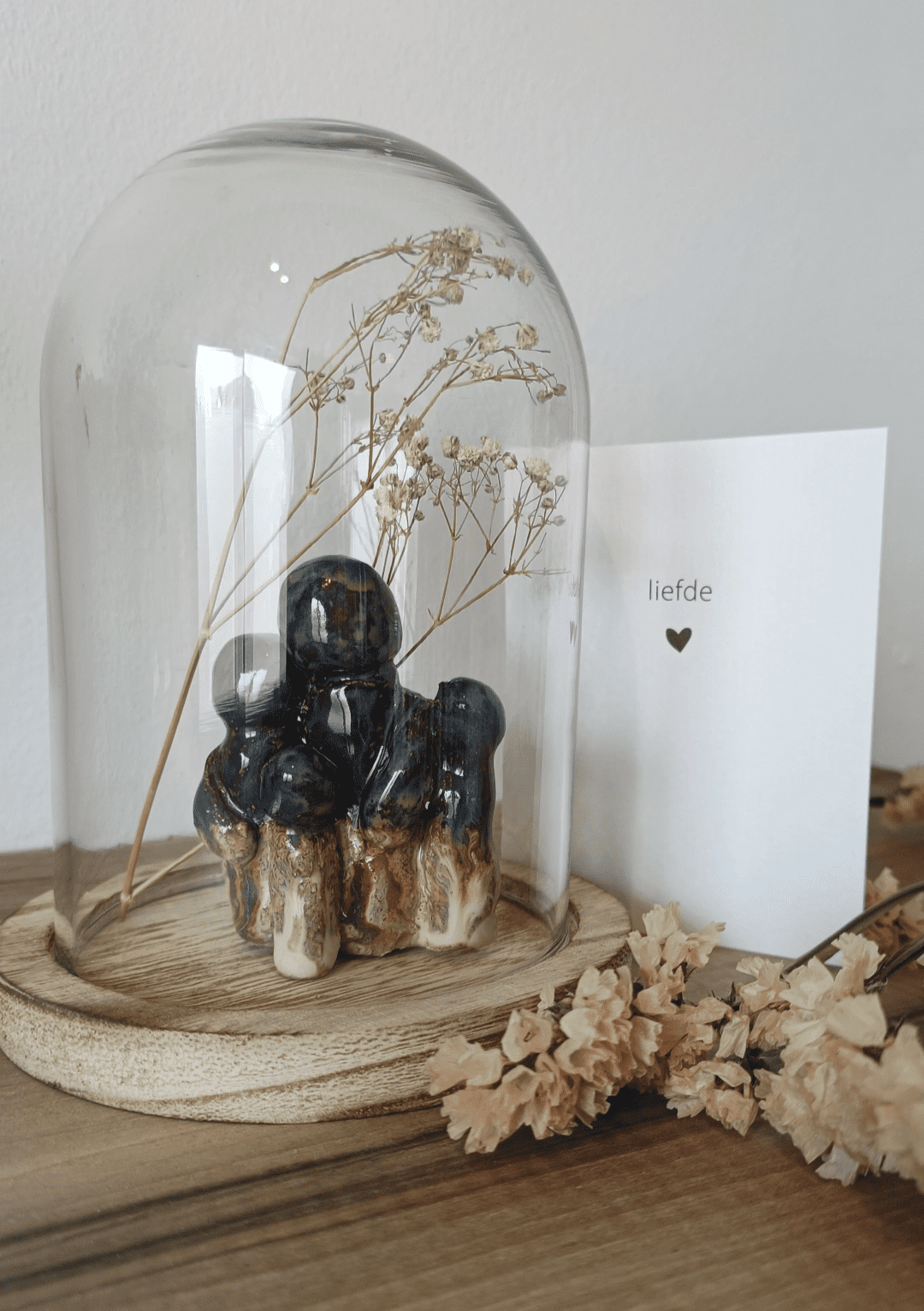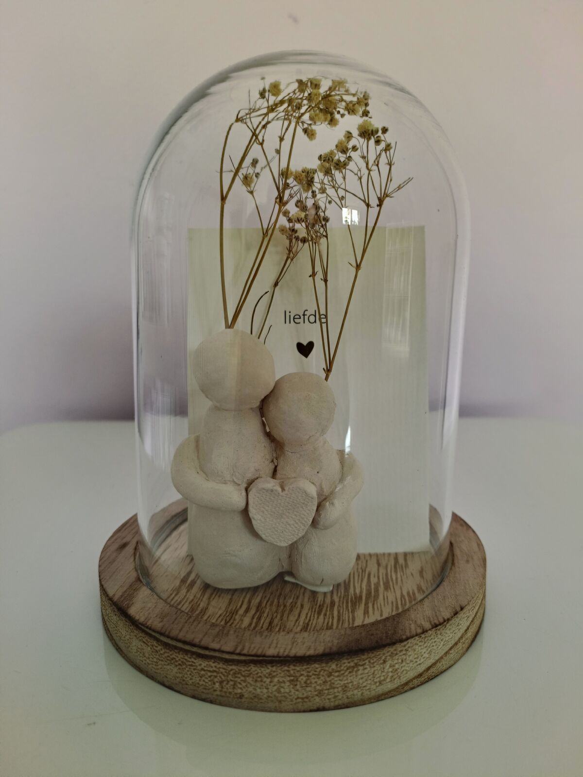 Na de workshop wordt je gemaakte creatie netjes afgebakken zodat het een mooie glazuurlaag krijgt. Bij het ophalen van jouw creatie wordt je opstelling onder een glazen stolp gezet, waar je een mooi en passend kaartje bij uit mag kiezen. Dit wordt ook incl. voorzien van een droogbloemetje en een lief bergkristal- edelsteentje.