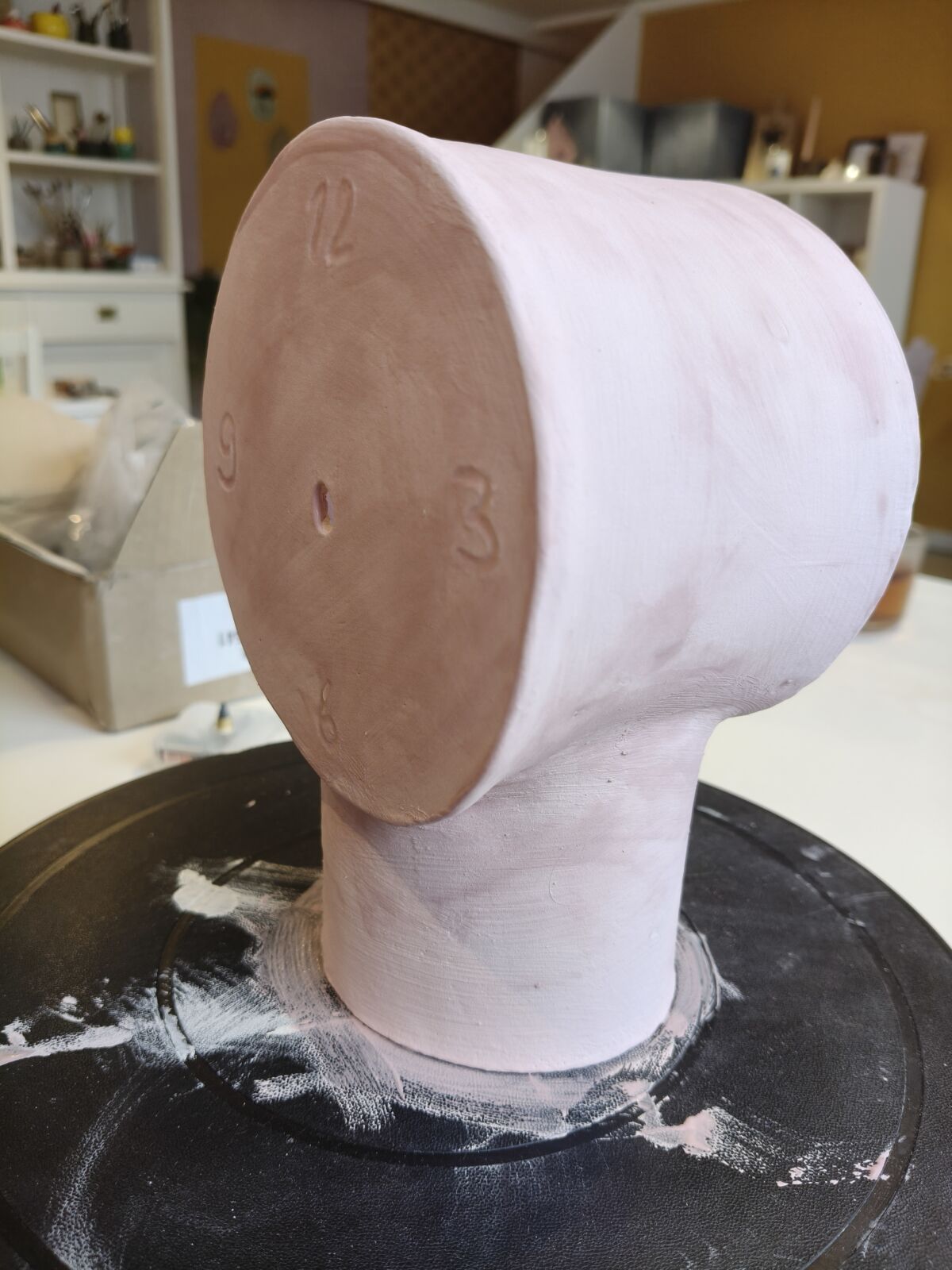Het klokje moet na de workshop eerst goed drogen en wordt daarna twee keer gebakken in de keramiekoven. Daarom kun je jouw kunstwerk pas na een aantal weken ophalen in het atelier.