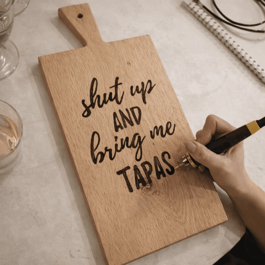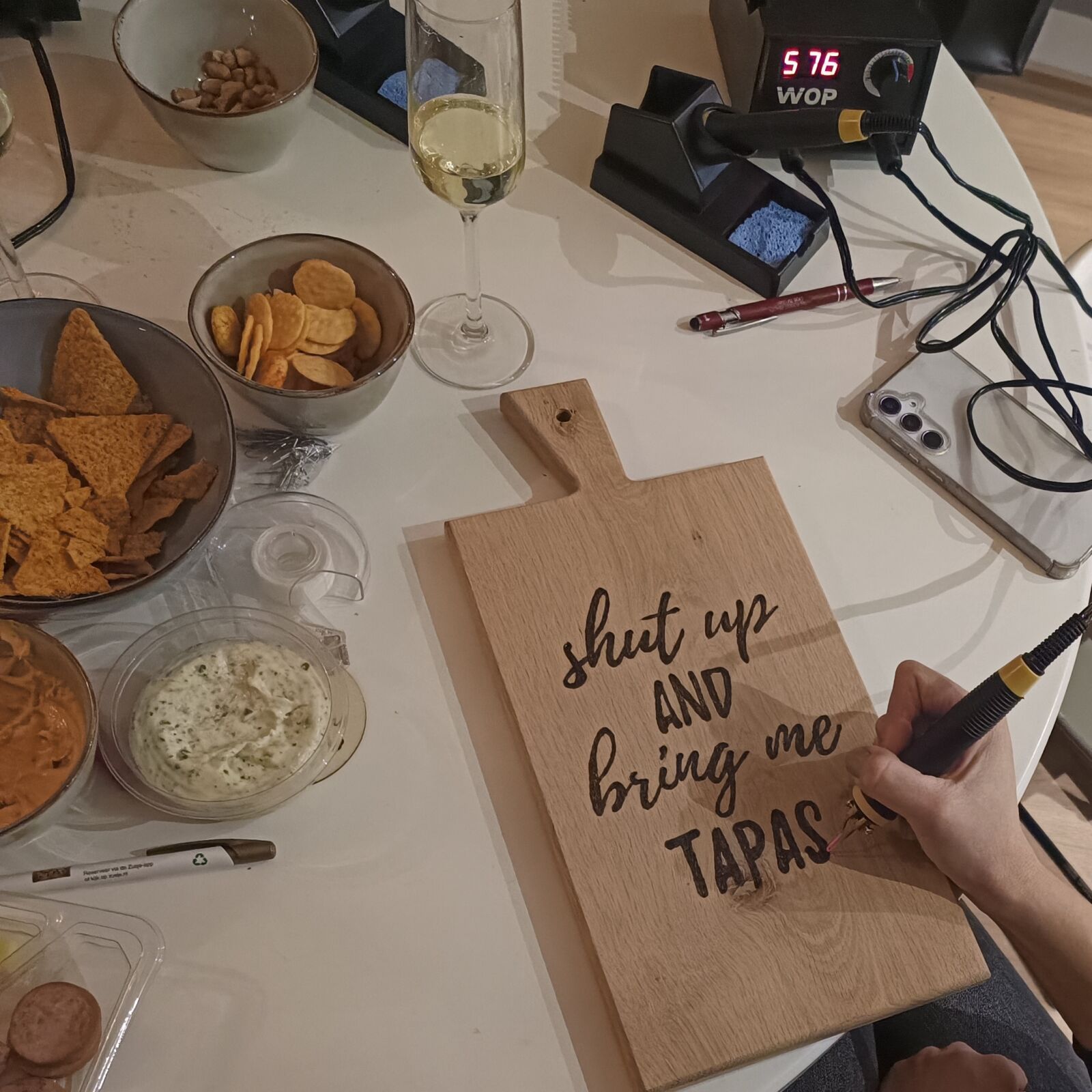 Tijdens deze workshop van 2 uur ga je een prachtige eikenhouten tapasplank versieren met jouw eigen ontwerp. Binnenkort ook keuze uit een Theedoos én een gave Bloemenpers